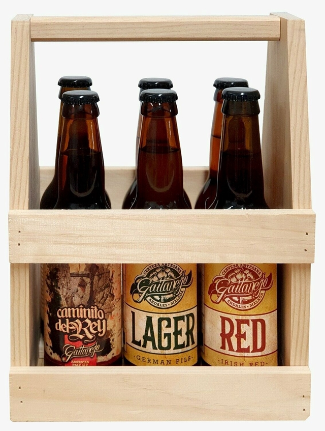 Caja de madera con 6 referencias distintas de la marca y serigrafiada a ambas partes.
